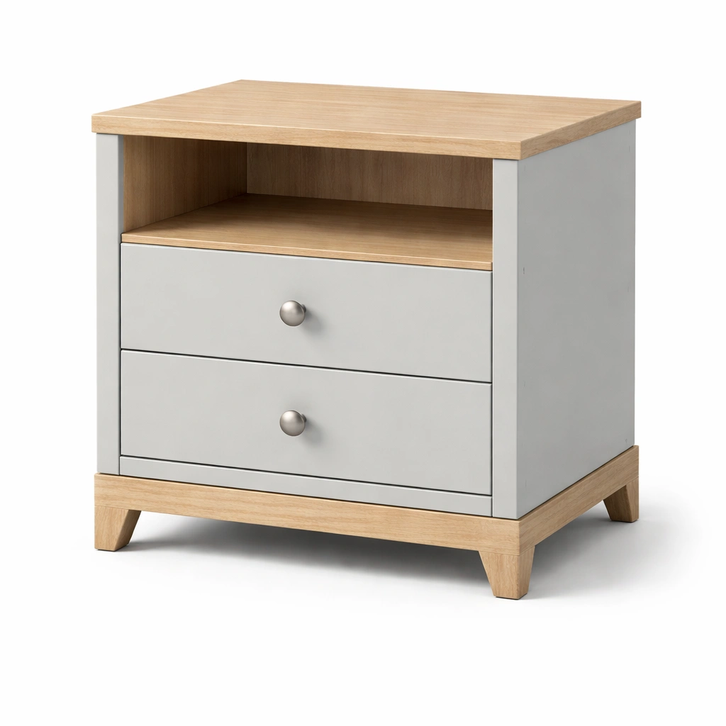 Il comodino è realizzato in legno composito con impiallacciatura in rovere e ha una finitura nei colori Grigio e Rovere chiaro. Include due cassetti per l'organizzazione e un ripiano aperto. Le dimensioni sono 50 cm di lunghezza, 40 cm di larghezza e 55 cm di altezza.